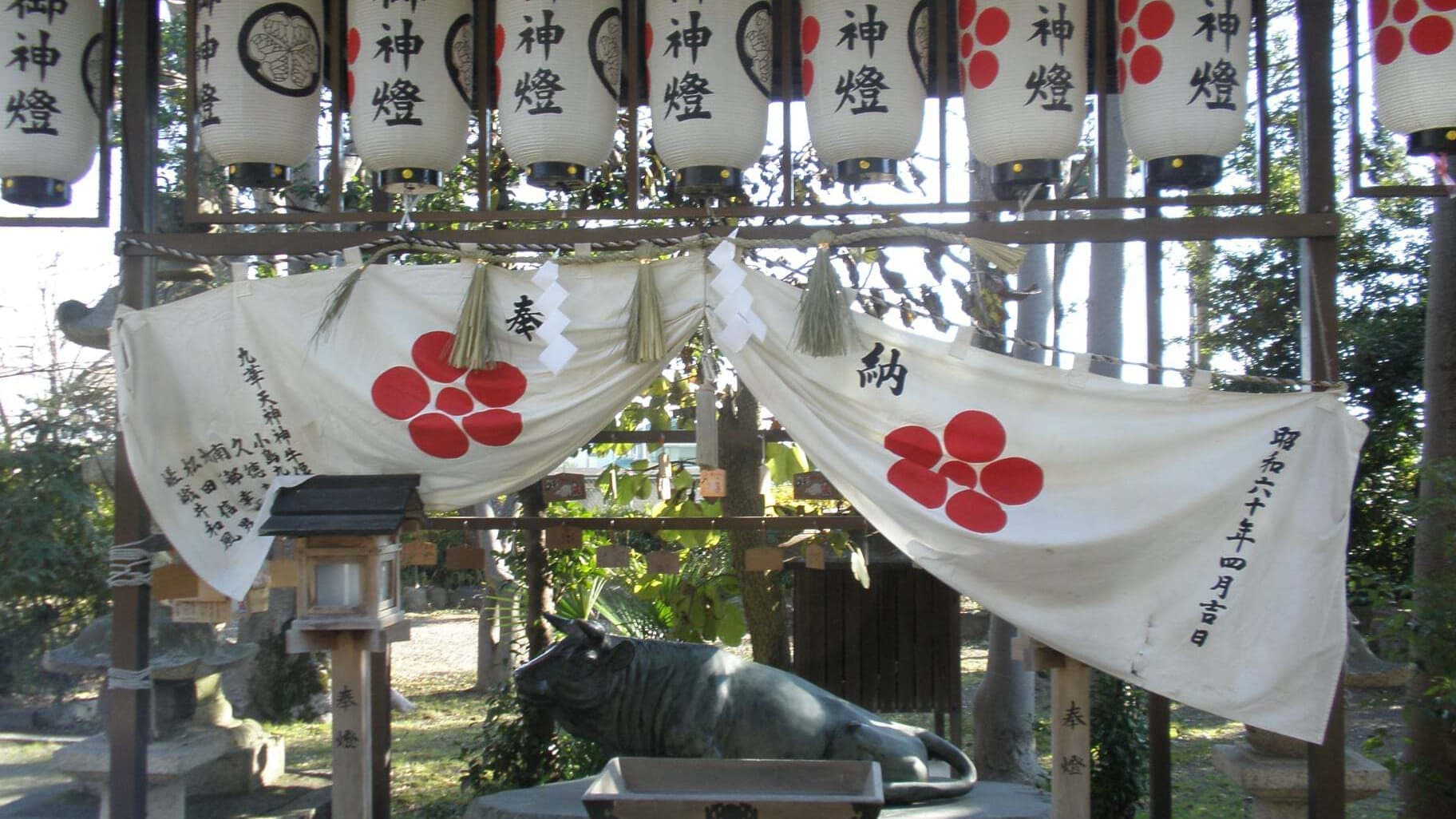 久松松平家の阻は、菅原道真の孫雅規(幼名久松麿)が知多郡の阿久居に配流され、その後子孫の道定の代に久松を名乗ることに始まります。 神牛像は学問の神様として知られる御祭神に願いを届けられるよう祀られてあります。